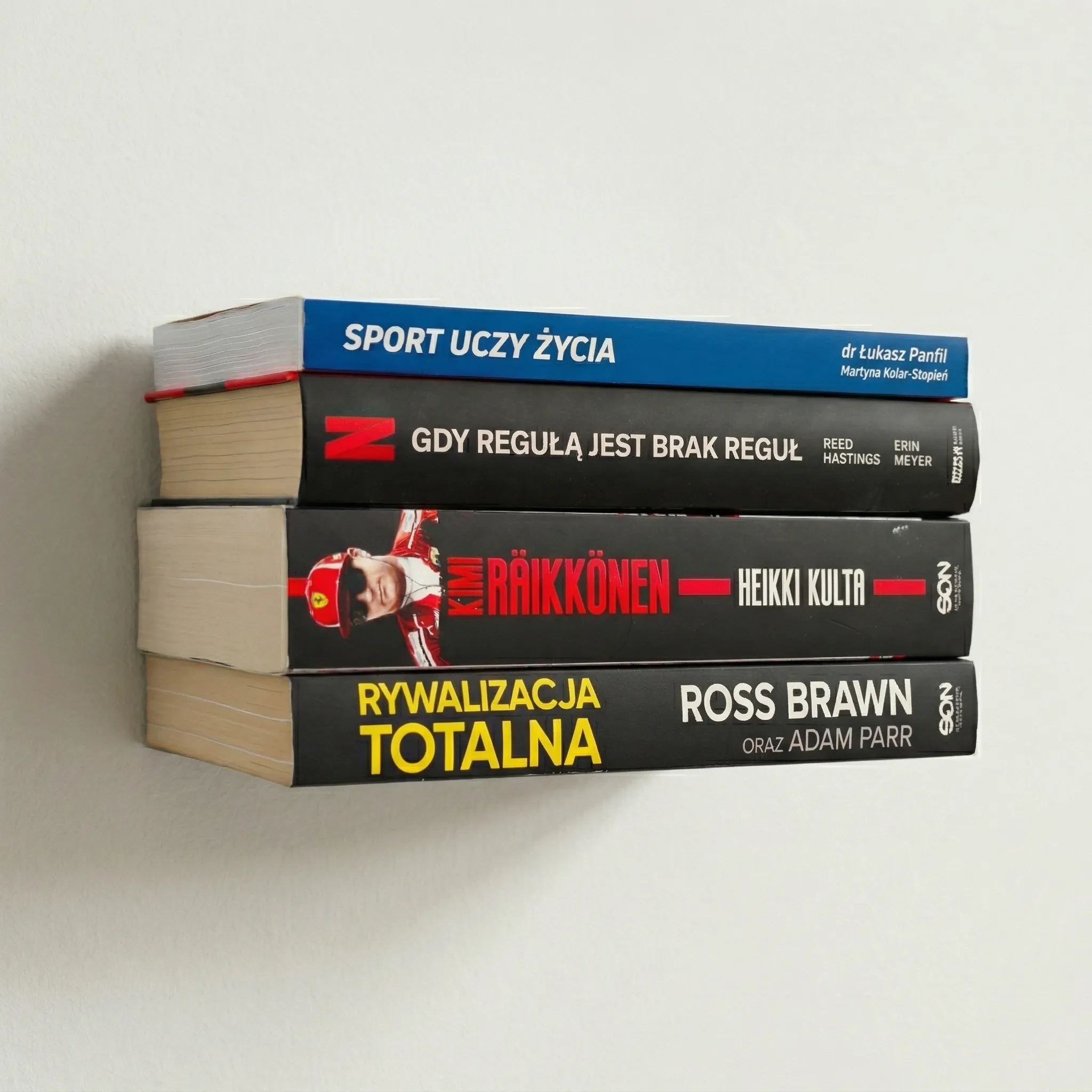 W dolnej części półki umieściliśmy dwa precyzyjnie wyprofilowane zaczepy. To one dyskretnie chwytają okładkę pierwszej, bazowej książki, całkowicie maskując metalową konstrukcję. To detale, których nie widzisz, sprawiają, że całość wygląda tak spektakularnie.